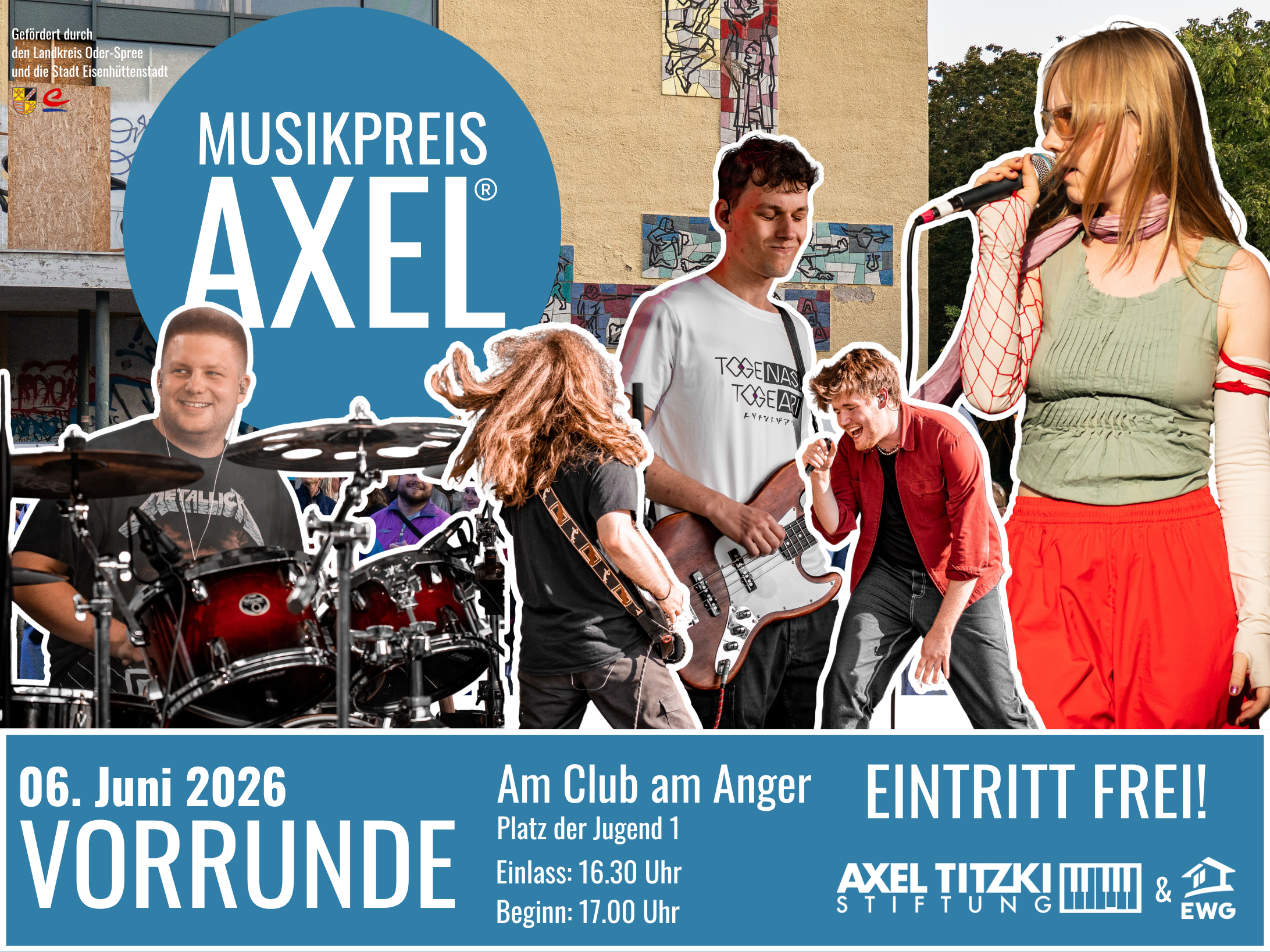 In der Vorrunde der 5. Staffel Musikpreis „AXEL“ treten wieder tolle Talente gegeneinander an und kämpfen um den 5. „AXEL“ und das Preisgeld von 500€ sowie weitere Preise.
